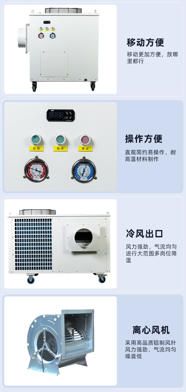 制冷级低噪音高静压离心风机采用电子无级调速技术,实现了冷气机低温制冷,使制冷能力更加强劲。